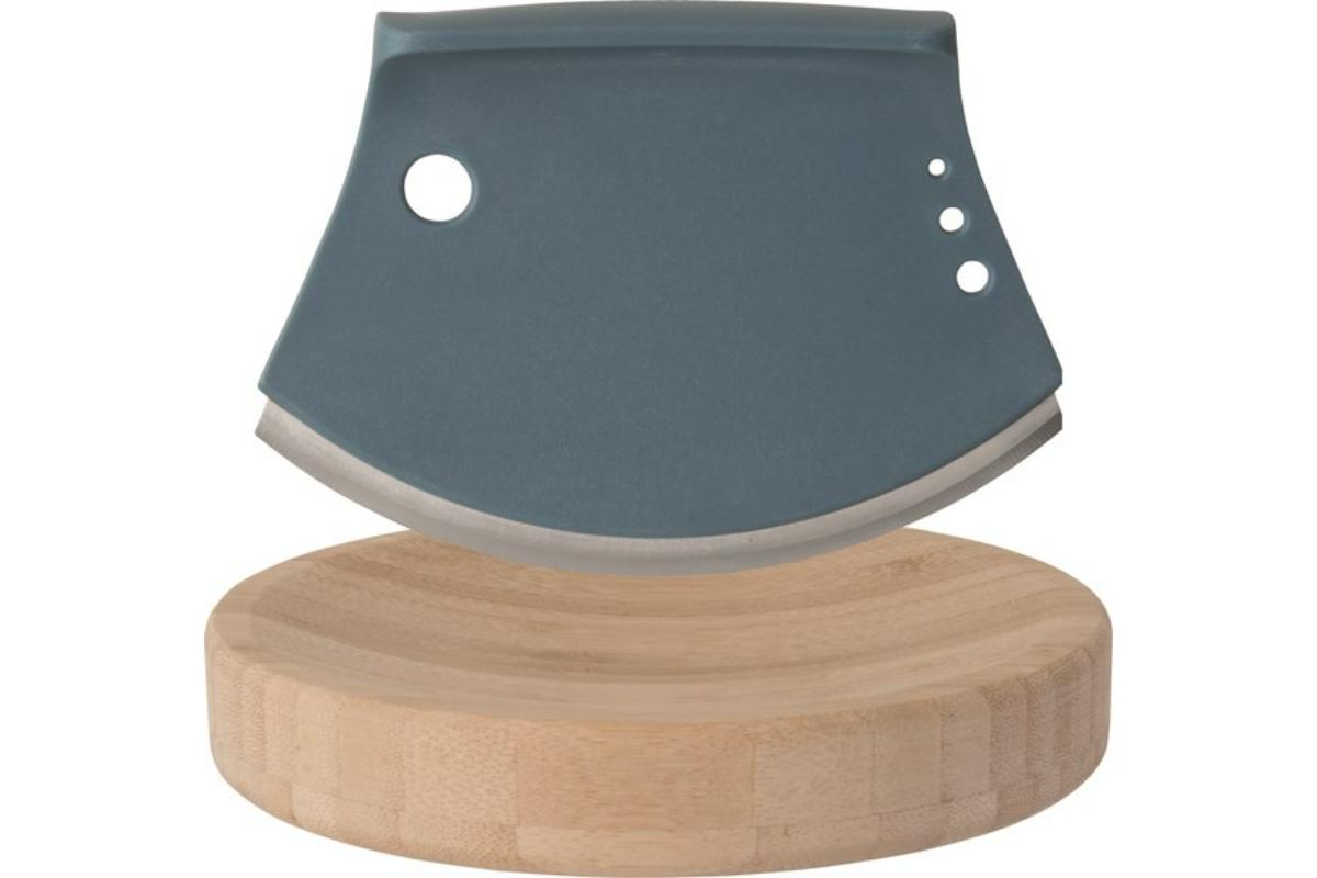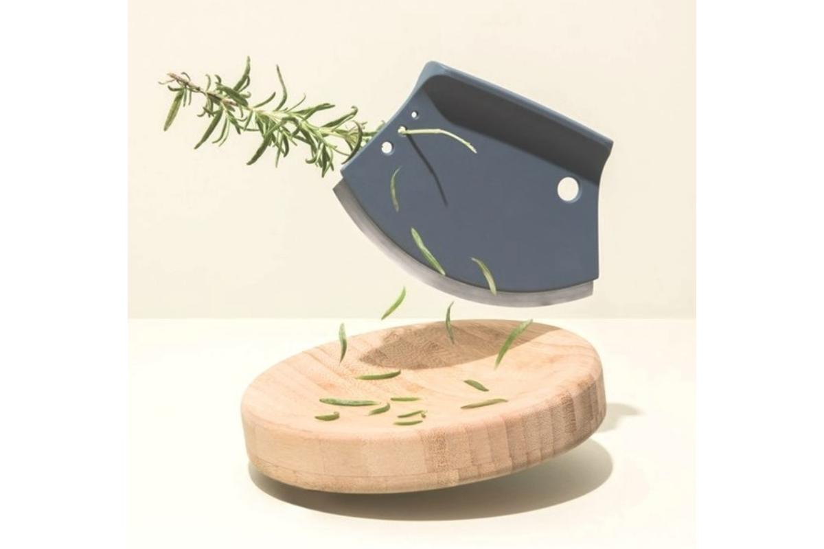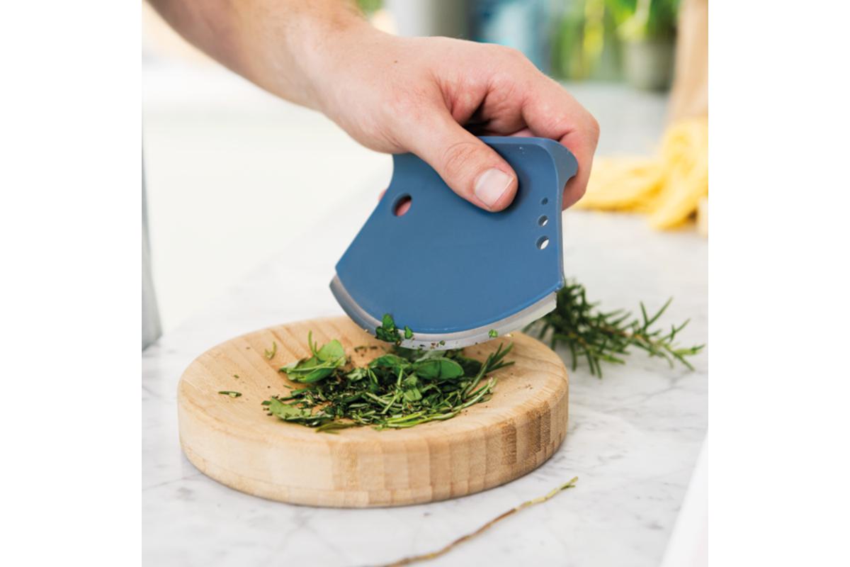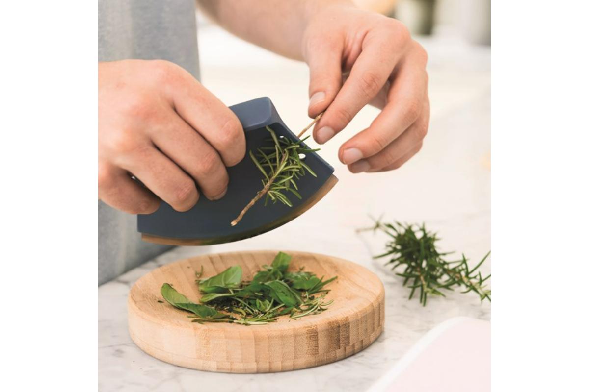 Breng je zelfgemaakte gerechten eenvoudig op smaak met vers gesneden kruiden. Peterselie, basilicum, munt, etc… snijden en fijnhakken is een echt plezier dankzij de harmonieuze rondingen van deze maanvormige kruidensnijder en het bijhorende plankje. Heb je een beetje rozemarijn of tijm nodig? Steek de takjes gewoon in een van de vier voorziene gaatjes, trek ze erdoor en hak de gevallen kruiden op het snijplankje.