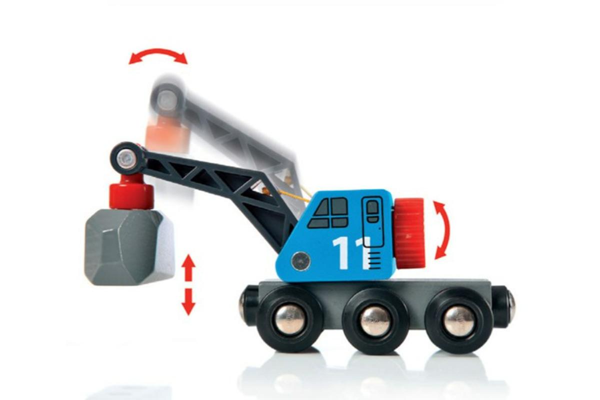 Deze set zit vol met plezier, waaronder twee vrachtwagens en een trein met kraanwagon, die goederen op en van het spoor kan tillen.